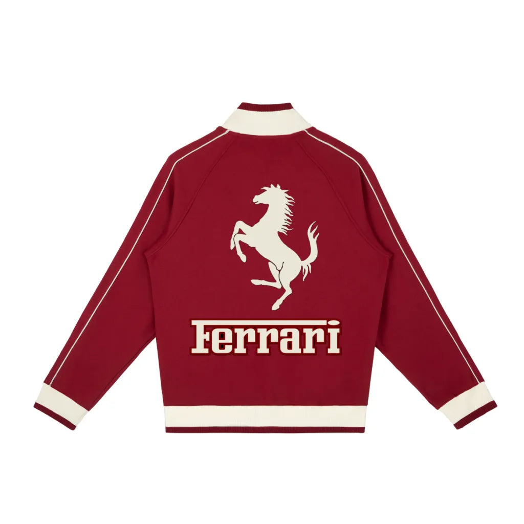 The back features the iconic "Ferrari" serif branding paired with the Prancing Horse, creating a powerful visual statement. Constructed from our signature 380gsm technical cotton blend, it provides the structure and warmth needed for the European winter season.